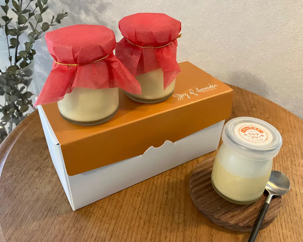 「Story of cheesecake.Ehime made」がつくる『ハーベスト』限定の「夕しぼり』瓶詰めミルクケーキ」は、ミルク風味のチーズケーキふわとろのミルクムースのWのおいしさを1つでお楽しみいただけるスイーツです。できたてを急速冷凍してお届けします。