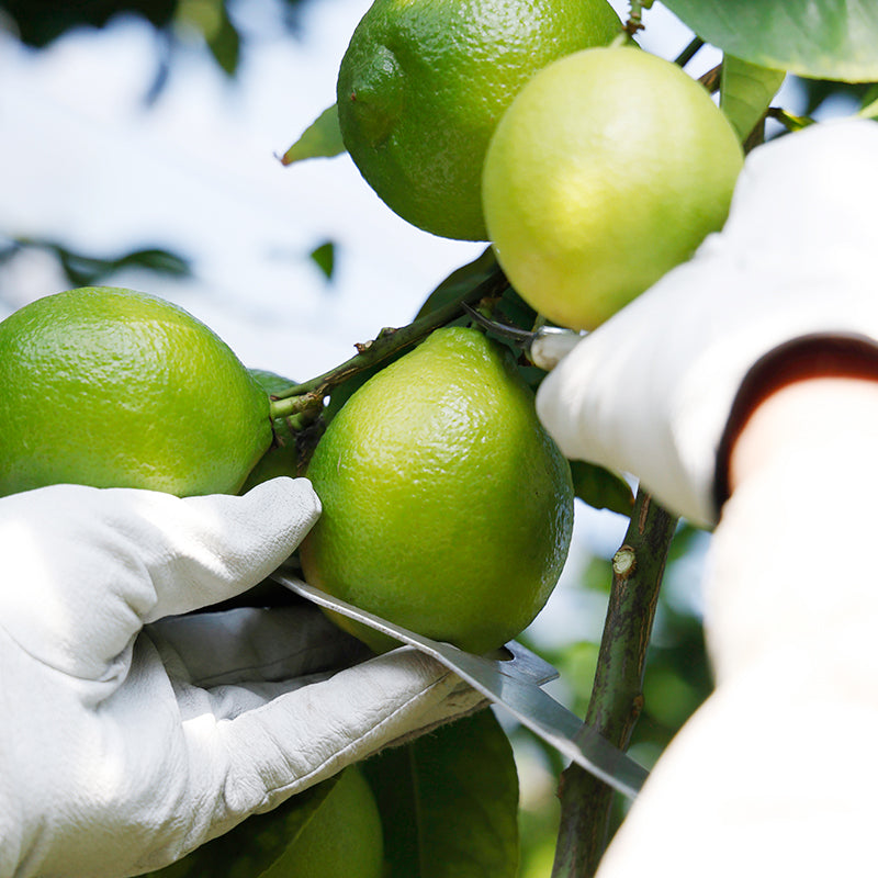 もぎたてが出荷されるのは10月から5月で、6月上旬から7月上旬にかけては冷蔵庫貯蔵のレモンになります。旬の始まりの10月、11月にお届けするのは、鮮烈な香りと柔らかな酸味が特長のグリーンレモンです。12月からは黄色く色付き、果汁量が多く、甘さが増すイエローレモンをお届けします。グリーンレモンは若々しい味わい、イエローレモンは芳醇なおいしさをお楽しみいただけます。冷蔵貯蔵のレモンは果実が柔らかく、熟した味が特長です。