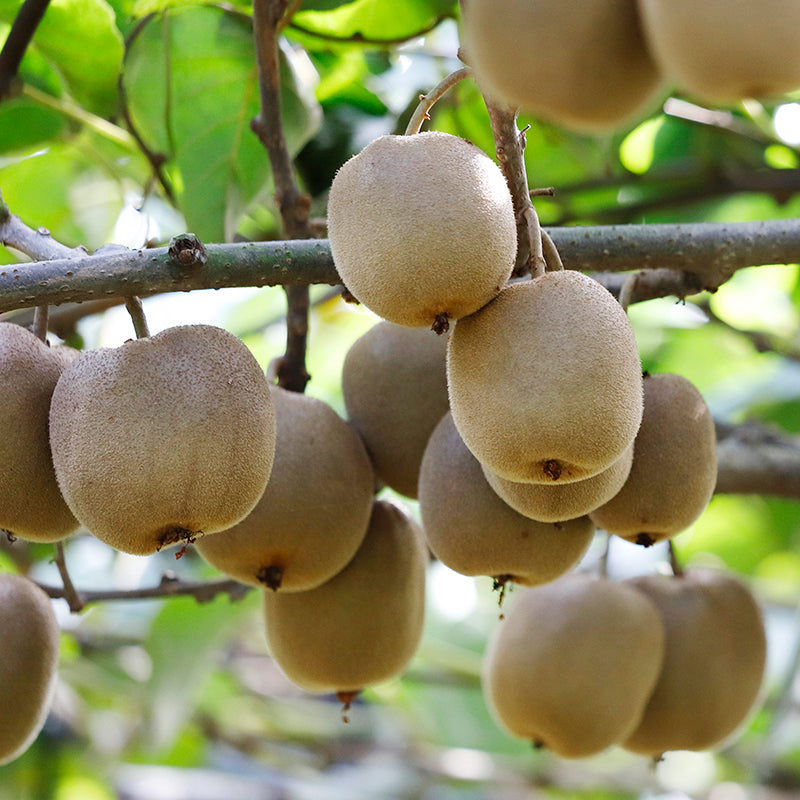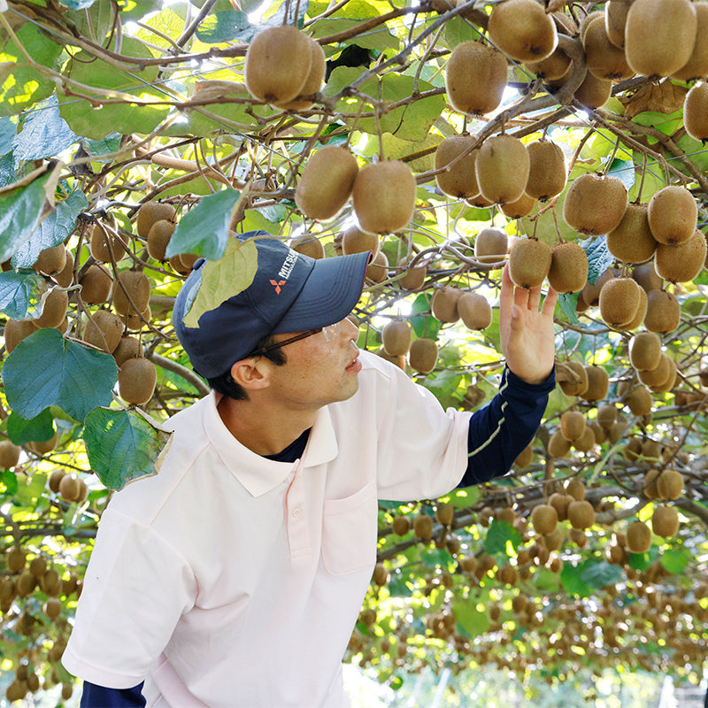 同農園の畑は、標高300mの山あいの緩やかな傾斜地に広がります。昼夜の寒暖差があり、日当たりと水はけの良い、キウイ栽培の適地です。一般的な平棚仕立てではなく、独自のアーチ型の棚を採用。この方法にすることによって収穫量は少なくなりますが、たっぷり日光があたります。堆肥を施し、養分を豊かに含んだフカフカの土をつくり、雨で土の養分が流れてしまわないように、適度に草を残しています。 赤キウイ「紅妃」は、白い果心を囲む種のある部分が鮮やかなルビー色をしているのが特長。香りと甘みが豊かで、酸味は少なく、キウイ特有の舌に感じるピリピリとした刺激がほとんどありません。黄キウイ「センセーションアップル」は、果実が大きめで、リンゴのような形をした品種です。
