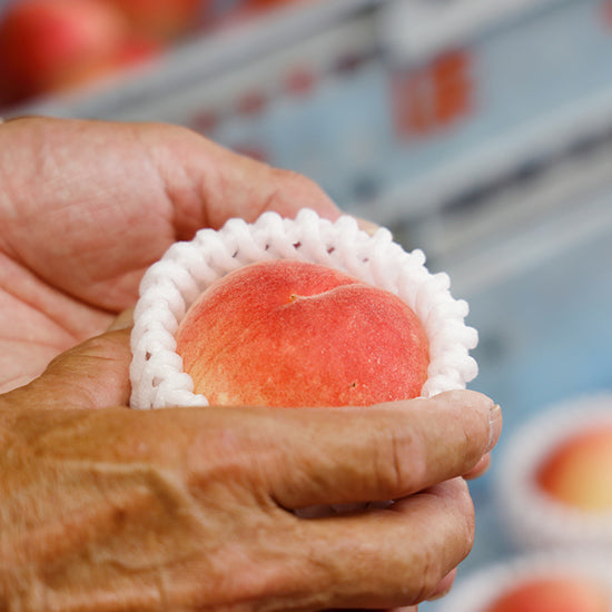 「綱崎農園」ではブドウやキウイフルーツの栽培に用いられている平棚仕立てという栽培方法を導入しています。桃園に棚を設置し、棚の高さに沿わせて枝を整える方法です。これによりすべての果実にまんべんなく太陽の光が注ぎ、たっぷり光を浴びることで桃は大きく甘く育ちます。桃はデリケートで傷みやすいため、熟す前に出荷する所もありますが、同農園では食べごろに熟すのを待って収穫する「樹上完熟もも」を基本にしています。傷つけないように手作業で1個1個選別して出荷します。 「綱崎農園」でおいしく実った桃の中から大玉を選りすぐり、産地直送します。ご注文をいただいた時期に食べごろで収穫される品種になるため、どんな味わいの桃に出会えるかは届いてからのお楽しみです。