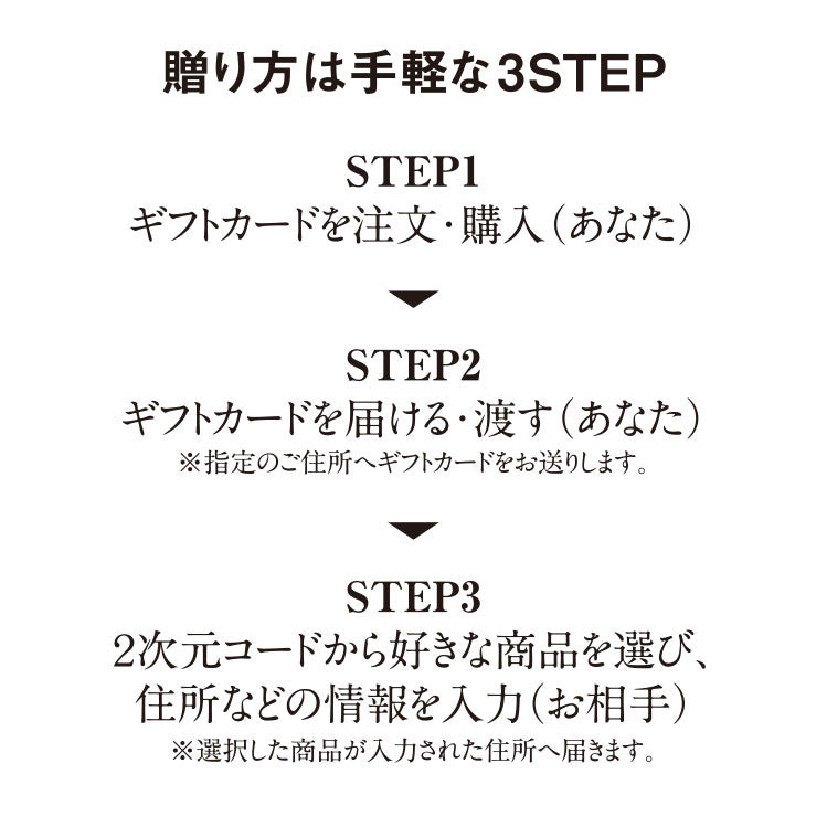 ※こちらは決済ページとなります。カートに追加しご購入手続きへお進みください。配送先住所はお申込者さまの情報をご入力ください。ご入金確認後、2週間以内に選べるギフトカードをお届けします。