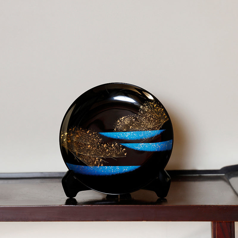 漆黒に金色の松と青色が映える皿。お祝いのギフトにもおすすめ。