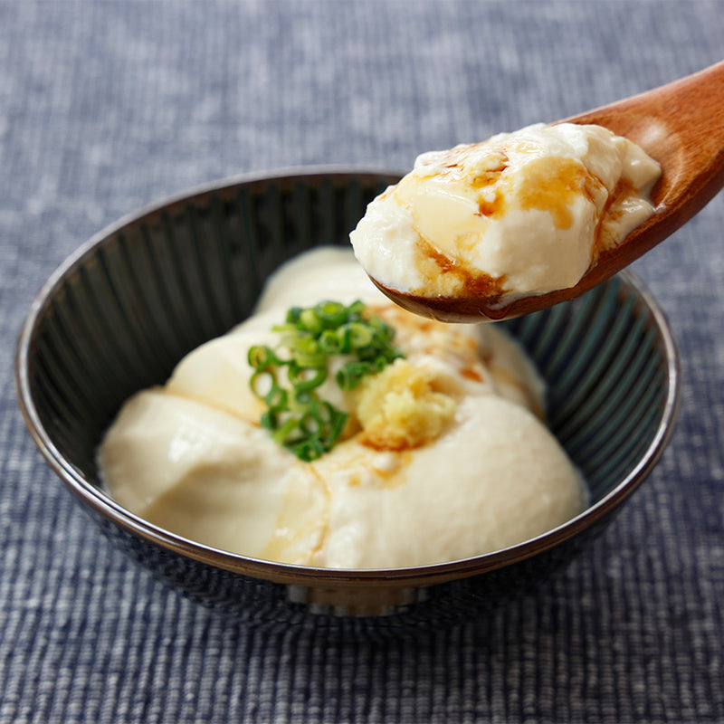 「豆道楽」の充填豆腐は、フクユタカという品種の大豆で作る「濃い甘豆腐」と希少な在来種の青大豆「濃い甘豆腐 青大豆」の2種類です。どちらもムースのようにクリーミーで、それぞれの豆の風味とともに上品な甘みがふわりと広がります。調味料や薬味をかけずに、そのまま食べても箸が進む逸品です。黒蜜やきな粉をかければ、デザートにもなります。「濃い甘豆腐 青大豆」は、「第7回全国豆腐品評会」充填豆腐部門の中四国大会で金賞、全国大会で5位に輝きました。