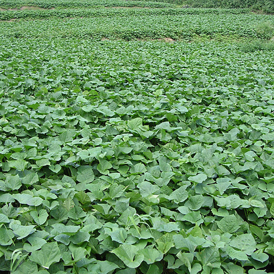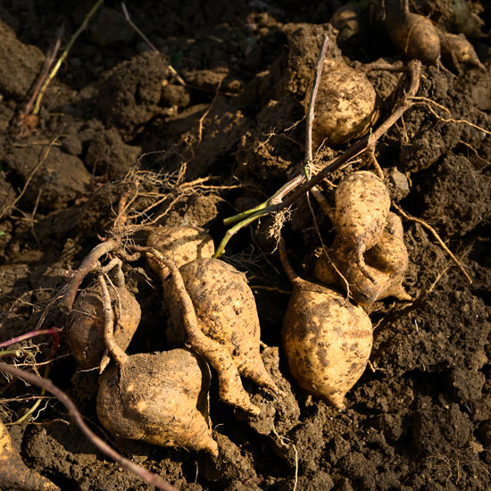 「七福芋」は、新居浜市北東部に位置する黒島港から船で約15分、周囲約10キロメートルの小さな島「大島」で栽培されています。生産量が少なく、市場に出回るのはごくわずかで、購入が難しいばかりか、目にする機会もほとんどないことから「幻の芋」といわれるようになりました。