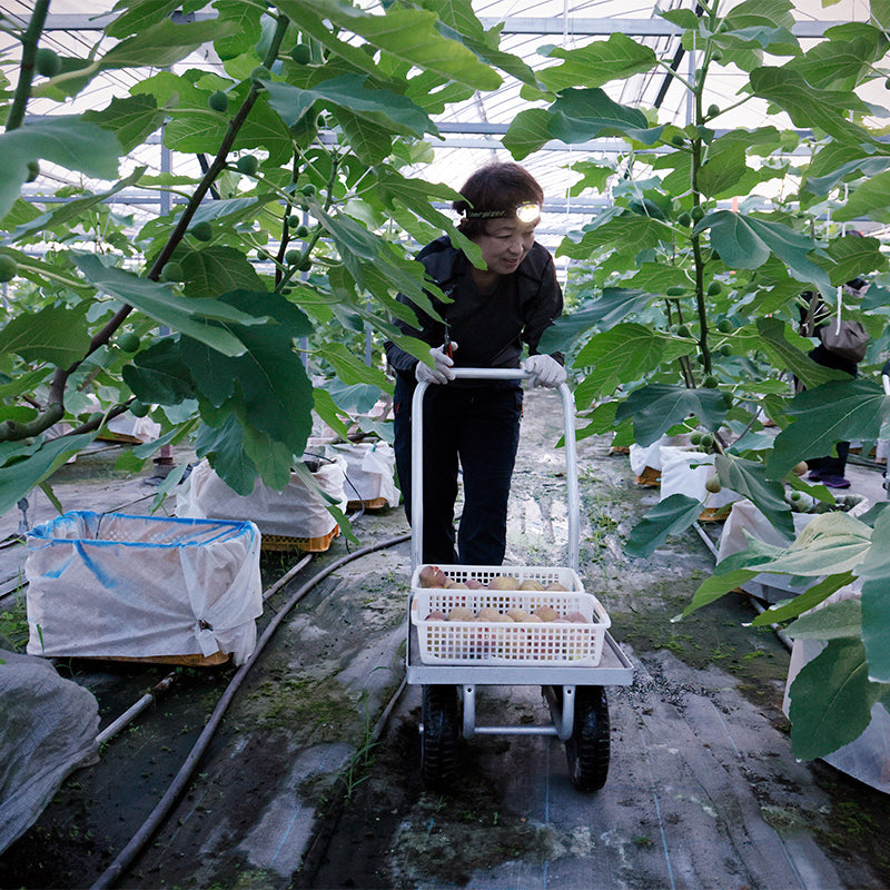 同農園は露地栽培から始まり、いちじくの生産に長く取り組んできました。3代目が木を病気から守る方法を研究した結果、現在はハウスでコンテナ栽培を行っています。適切なタイミングで有機肥料を混ぜ、栄養豊かな土をつくり、草引きをまめに行います。水は木の状態を細かく見て、気候を考慮し、適度な頻度と量を調整しながら与えます。