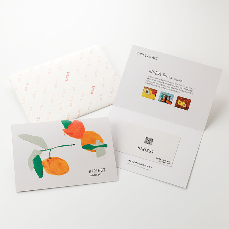 贈られた方はカードを使って簡単に商品を選択可能。選ぶ楽しみとともに、アートが放つ明るさが心を和ませます。売上の一部は作品使用料として池田さんへ還元され、地域と社会に息づく循環の一助に。大切な方への贈り物に、企業の周年記念や福利厚生にも最適な、愛媛の恵みとアートの力が融合した特別な一枚です。