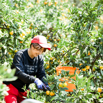 愛媛県のみかん栽培発祥の地といわれ、おいしいかんきつの産地として知られる宇和島市吉田町で3代続く「山内ファーム」。宇和海を見下ろす急傾斜の畑で「我が子を育てるように」をモットーに、必要な時期に必要なことを施し、手間をかけ、24種類のかんきつを育てています。それらはベストな熟し加減で収穫され、貯蔵庫で少し寝かせ「一番いい味」に仕上げられるのです。