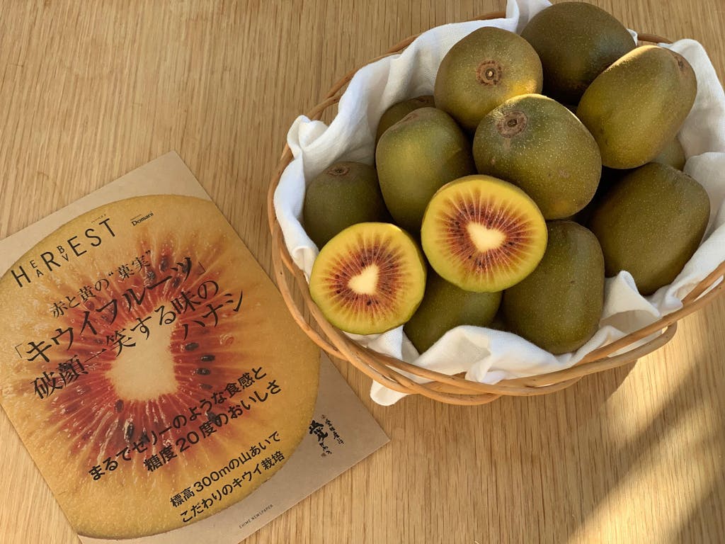 同農園の畑は、標高300mの山あいの緩やかな傾斜地に広がります。昼夜の寒暖差があり、日当たりと水はけの良い、キウイ栽培の適地です。一般的な平棚仕立てではなく、独自のアーチ型の棚を採用。この方法にすることによって収穫量は少なくなりますが、たっぷり日光があたります。堆肥を施し、養分を豊かに含んだフカフカの土をつくり、雨で土の養分が流れてしまわないように、適度に草を残しています。 赤キウイ「紅妃」は、白い果心を囲む種のある部分が鮮やかなルビー色をしているのが特長。香りと甘みが豊かで、酸味は少なく、キウイ特有の舌に感じるピリピリとした刺激がほとんどありません。黄キウイ「センセーションアップル」は、果実が大きめで、リンゴのような形をした品種です。