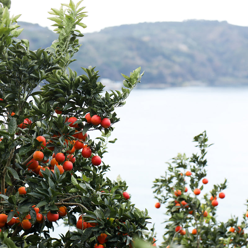 愛媛県産のかんきつは、なぜ「愛されるおいしさ」に育つのでしょうか。その秘密は、栽培が行われている場所にあります。かんきつを栽培する畑の多くは、海に面する山の斜面に広がっています。登るのが大変な急傾斜の畑には、太陽の光が降り注ぎ、さらに海からの反射光と畑の石垣からの照り返しもあります。この「3つの太陽」をたっぷり浴びることで、甘く実るのです。また水はけがよく、潮風が運んでくるミネラルを含んだ土の力も手伝い、コクのある濃い味になります。
